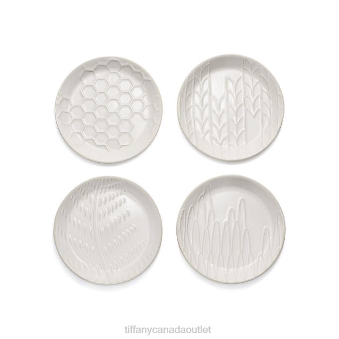 Flora & Fauna Round Dish Set In White Stoneware, Set Of Four.