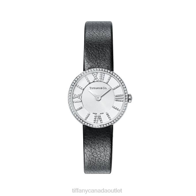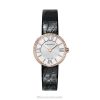 Women’s Watch In Stainless Steel. White Dial Set With Round Brilliant Diamonds. Carat Total Weight .28. On A Black Leather Strap. 24 Mm Case. Quartz Movement. Water Resistant To 30 Meters/100 Feet/3 ATM. Swiss-made.