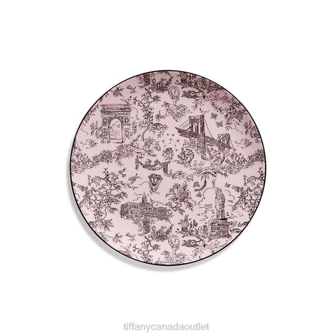 Tiffany Toile Designs Are A Whimsical Tribute To Tiffany’s Hometown And Its Heritage. Playful Yet Elegant, The Artwork Is Inspired By An Illustration Of New York City From The Tiffany Archives. The Brooklyn Bridge Meets Bird On A Rock; The Statue Of Liberty Mingles With A Tiffany & Co. Diamond. This Morganite-colored Dessert Plate Features The Elaborate Print With A Black Hand-painted Rim. Pair This Plate With A Tiffany Toile Mug To Complete Your Collection.