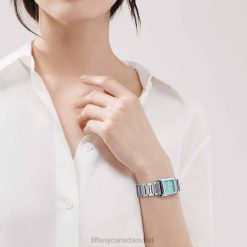 Watch In Stainless Steel. Tiffany Blue Dial With Baguette Diamond Indexes. 22 X 22 Mm Case. Carat Total Weight .04. Quartz Movement. Water Resistant To 50 Meters/160 Feet/5 ATM. Swiss-made.Note, Engraved Items Will Be Delivered After Father’s Day.