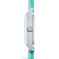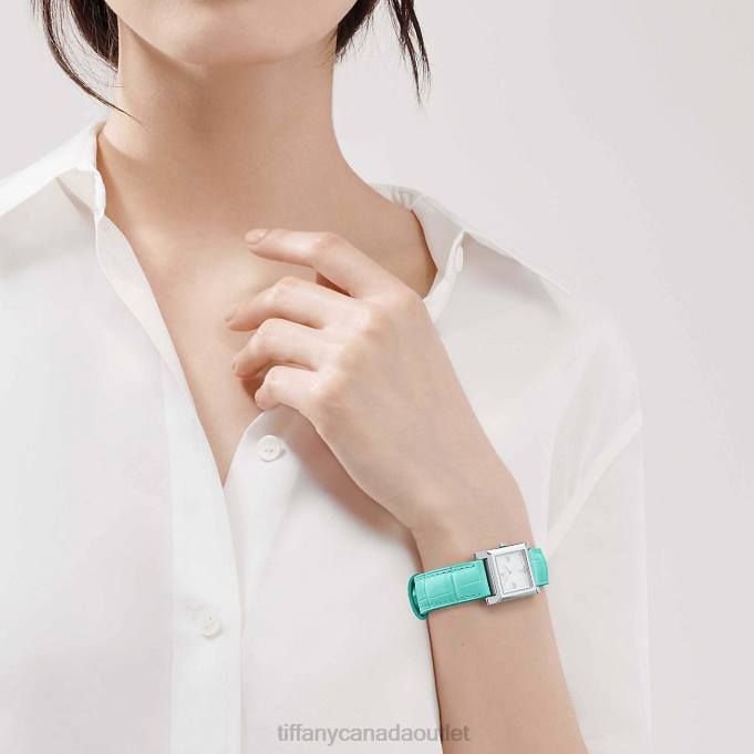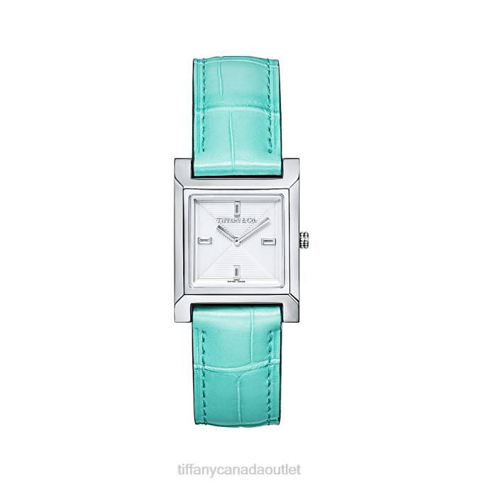 Watch In Stainless Steel. Silver-colored Dial With Baguette Diamond Indexes. 22 X 22 Mm Case. On A Tiffany Blue Alligator Strap. Carat Total Weight .04. Quartz Movement. Water Resistant To 50 Meters/160 Feet/5 ATM. Swiss-made.Note, Engraved Items Will Be Delivered After Father’s Day.